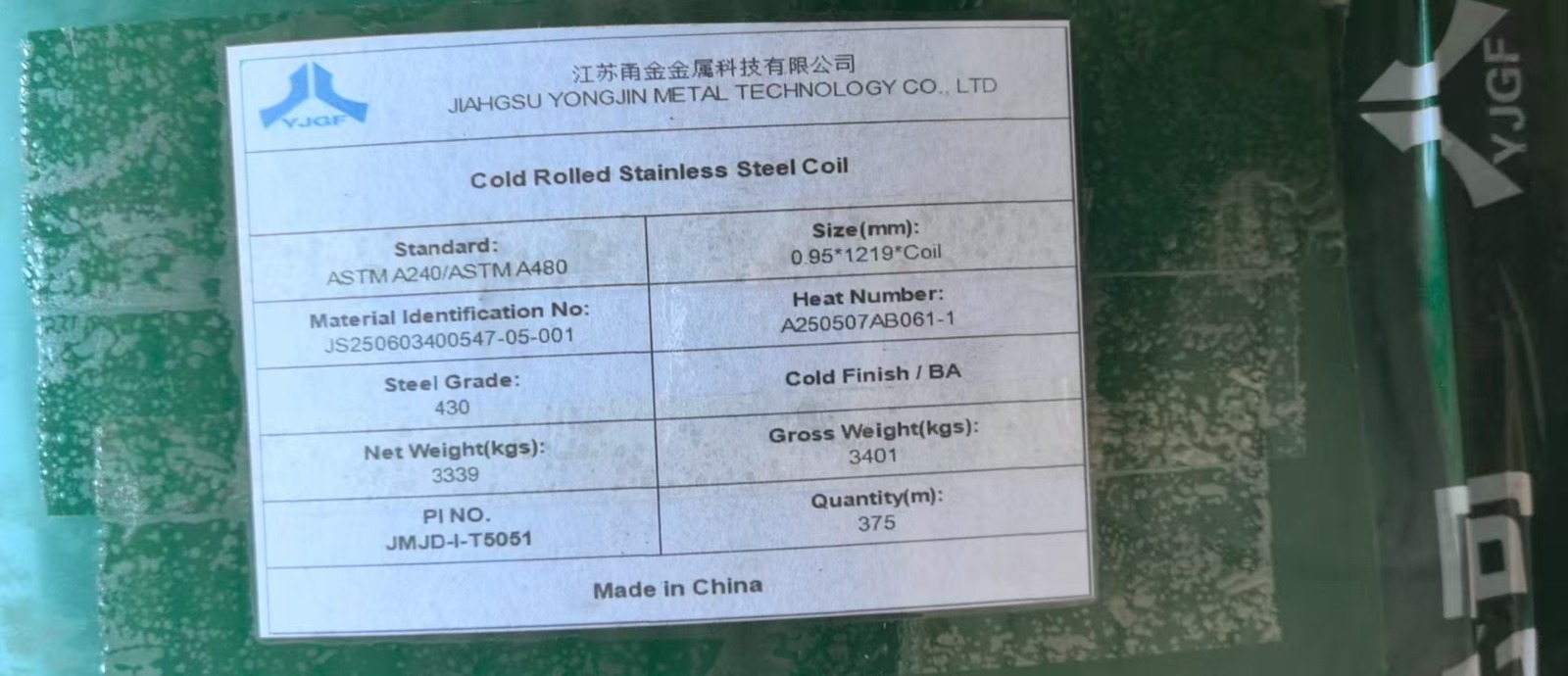 محموله 49 تن کویل استنلس استیل گرید 430 سرفیس BA برند YongJin متعلق به بازرگانی در تهران ، در انبار شرکت JMJDWX در شهر ووشی درحال آماده سازی و بارگیری جهت ارسال به بندر عباس می باشد.